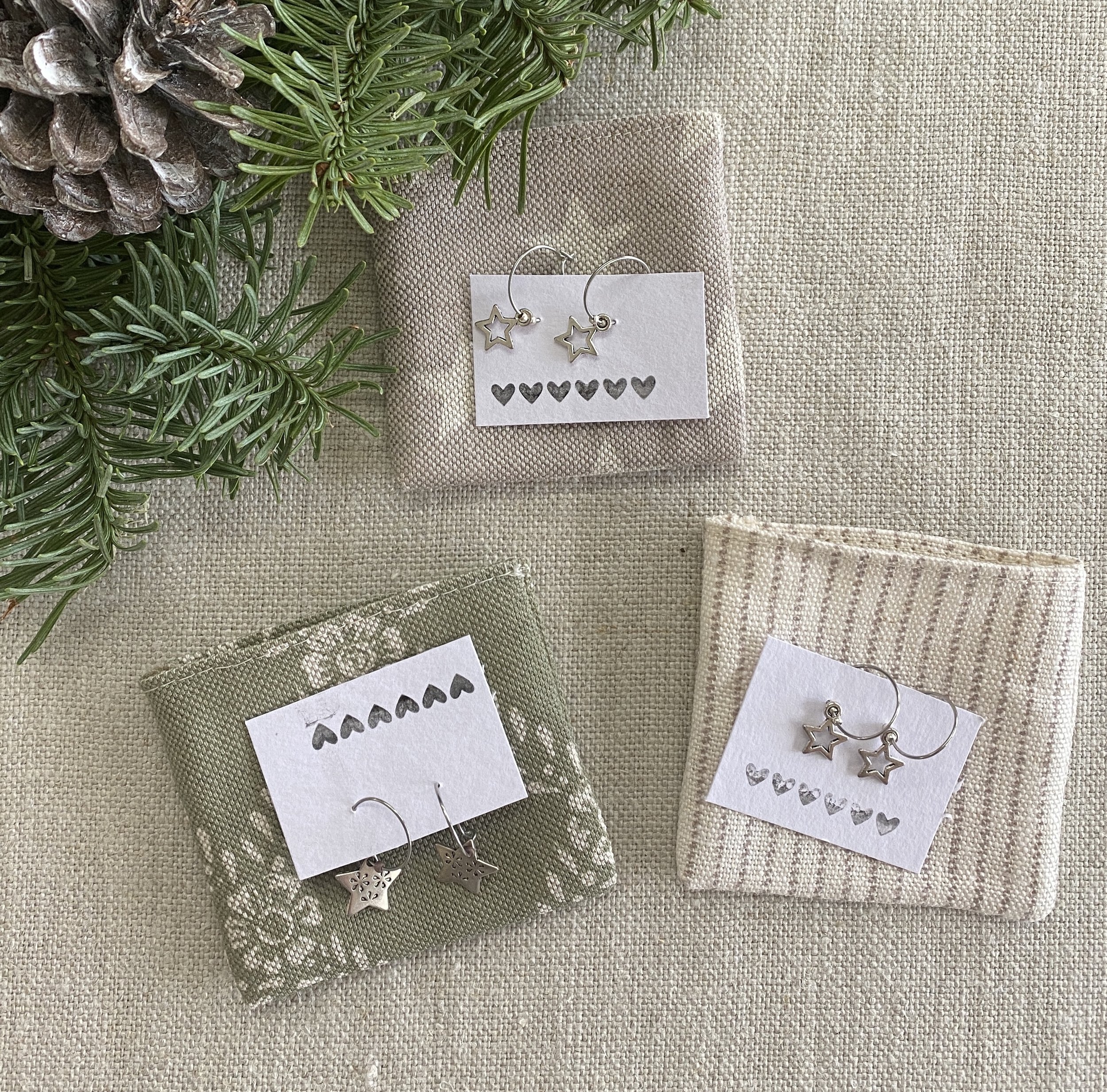 HYPOALLERGENIC hoop earrings with star charm in a tiny fabric pouch, if you have a preference for colour or design on the pouch we are happy to do that for you, gift wrapped and ready for your stocking!