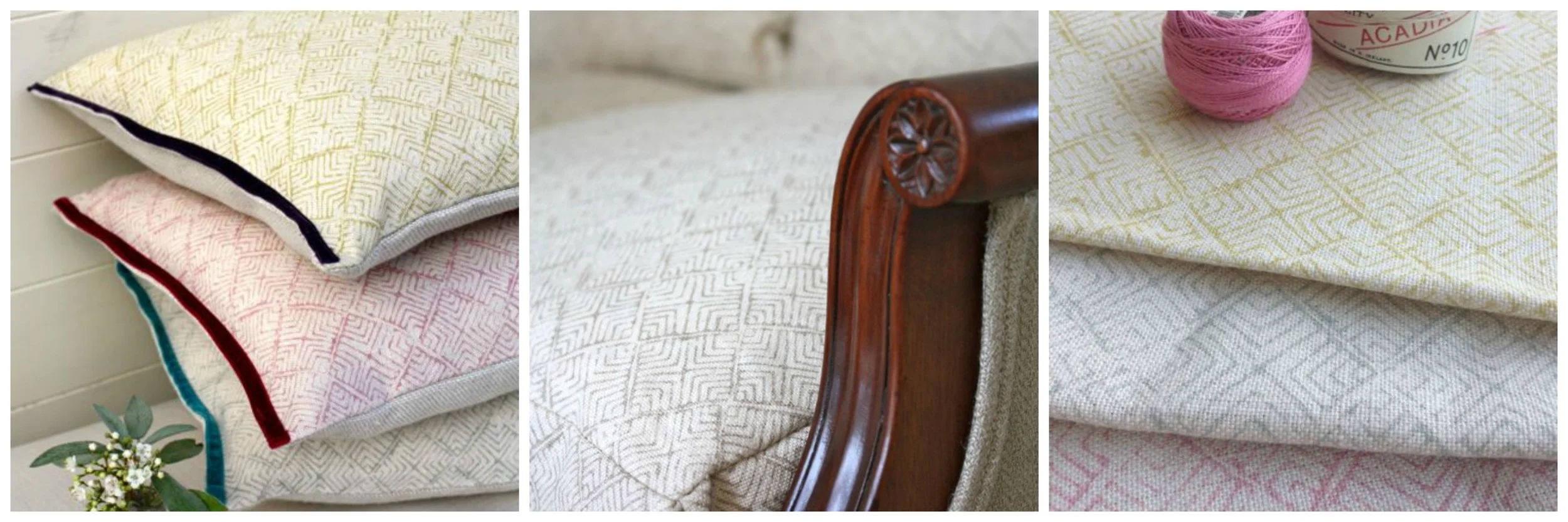 a softly geometric block print design, latika is printed on our soft heavy linen, eminently usable in all sorts of places, footstools, headboards, chairs and blinds…...