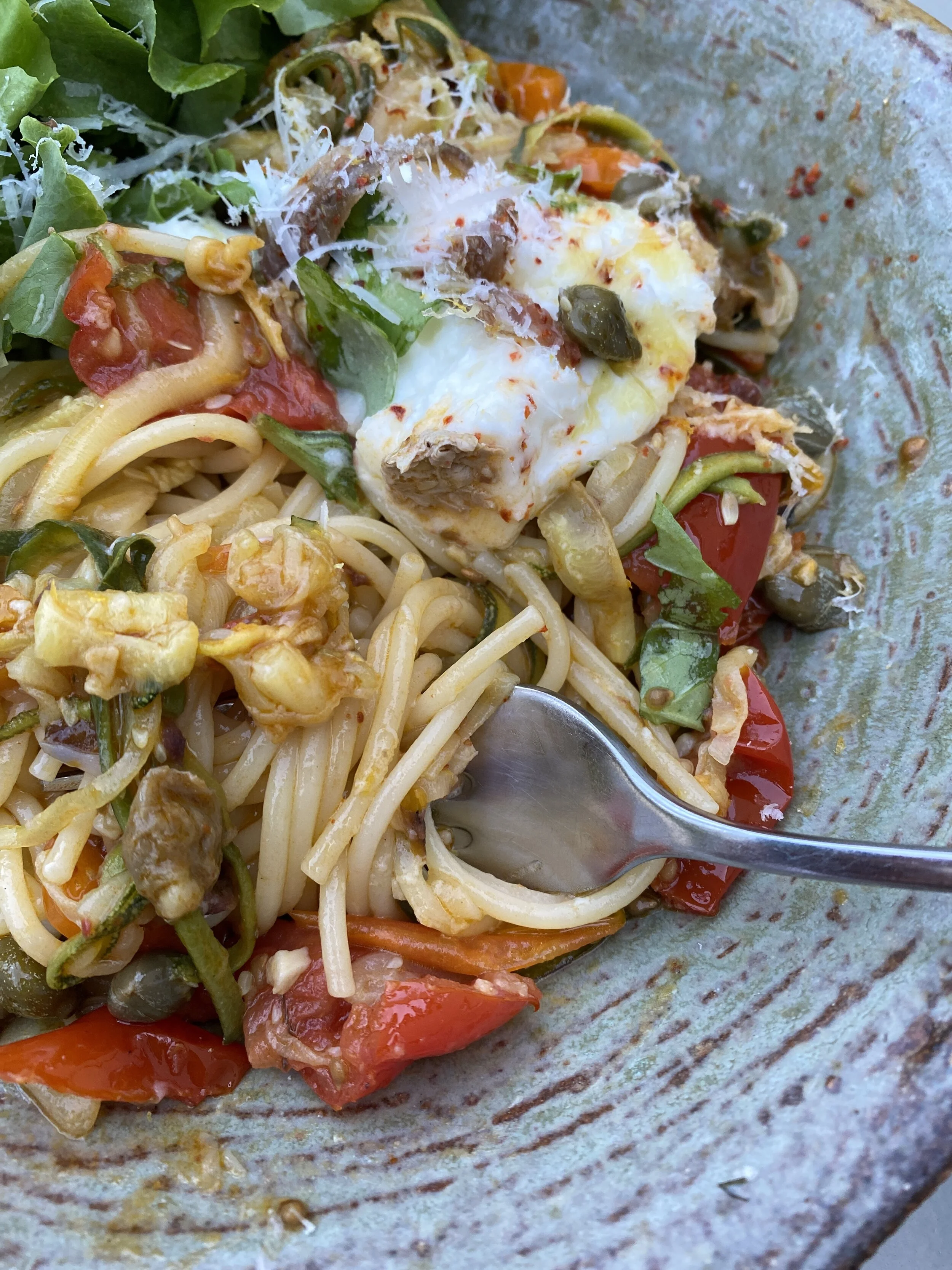 Depending on how many people you are serving, thinly slice some courgettes (a generous amount as they will wilt down loads) - in my pic I think I was bored of rounds so I had done long thin batons, but no matter , rounds are easier!! Liberally slosh some extra virgin olive oil (at least a couple of tbs) in a large frying pan that can go in the oven. Add the courgettes a good pic of seasalt , a couple of sliced garlic cloves some chopped red chilli - or red chilli flakes, and a couple of anchovies (optional and you can’t actually tell there are anchovies in it they just add a depth of flavour) toss over a medium heat to get them cooking - I then put my pan in the oven with a lid on (this is because I cook on an everhot - bit like an aga), feel free to cook slowly on the hob. When they are starting to get soft and mushy add a handful or two of cherry tomatoes cut in half (good for using up any in the greenhouse that have split or are going over, you do really want fresh and ripe tomatoes here not tinned ones) add some capers and chopped olives - fridge clearance (again optional) ! Stir it all together and leave over a low heat or in the oven to blip away .